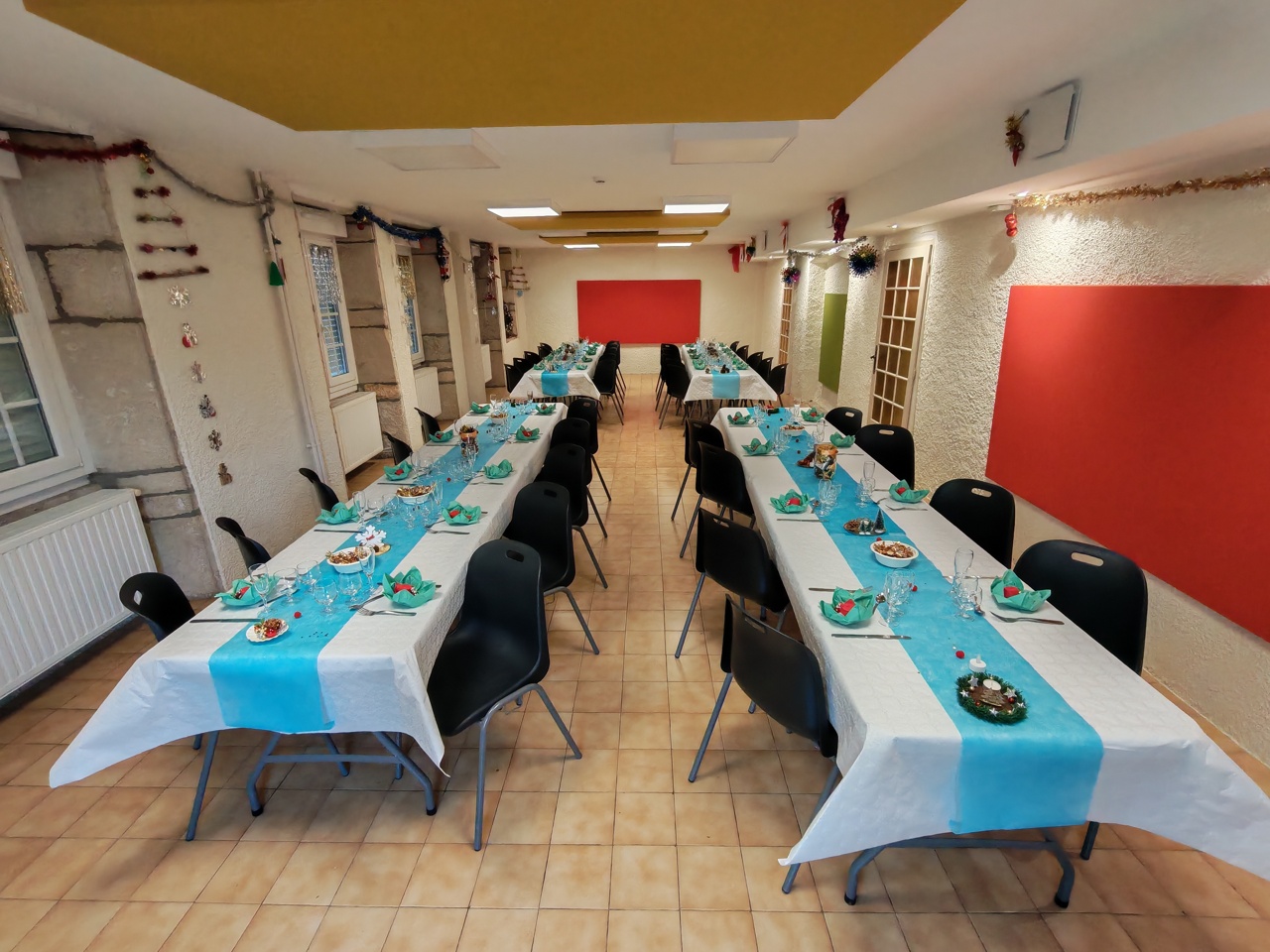 - Capacité : 60 personnes pour la salle, 15 pour le couchage.