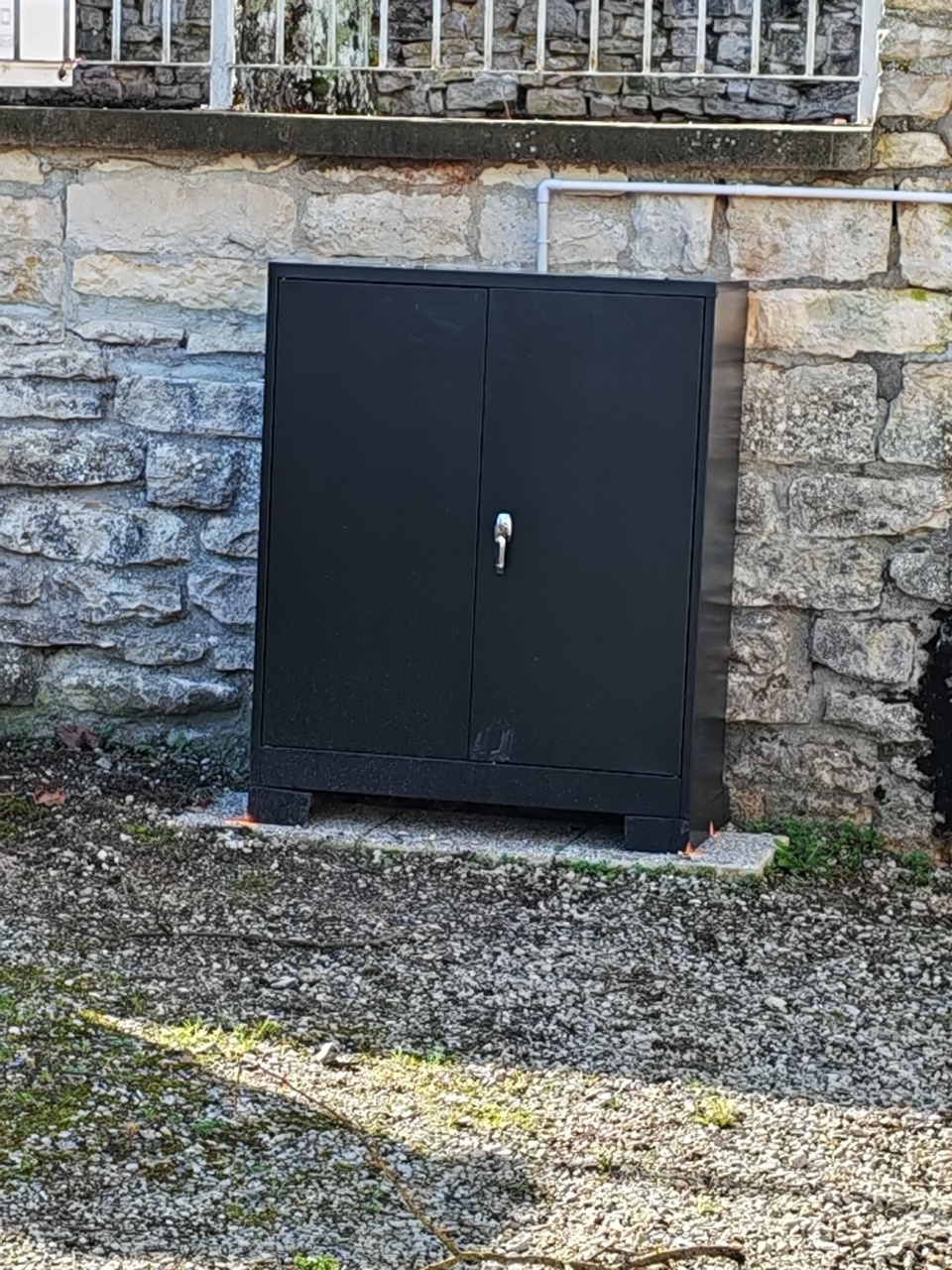 - Local à vélos avec coffret charge batterie vélo électrique en extérieur.
